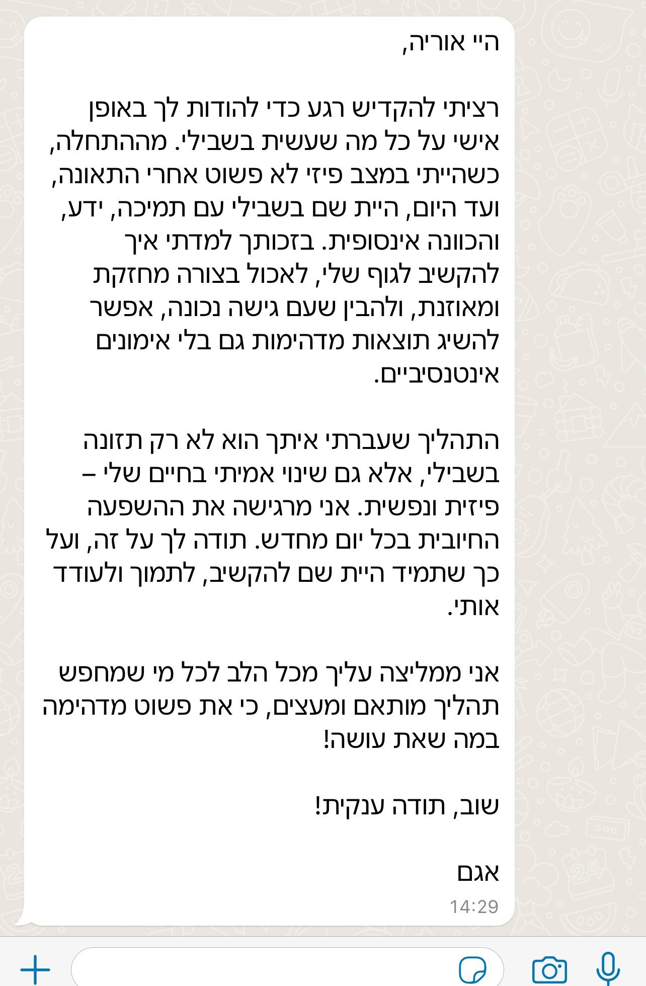 ב-OR-IA את מקבלת מעטפת מלאה: ליווי תזונתי וכלים מנטליים, קהילה תומכת ומעצימה, ערכות פתיחה ומתנות לאורך הדרך, ותכנים שמחזקים אותך להתמיד ולגלות את הכוחות שבך גם מחוץ לסטודיו.