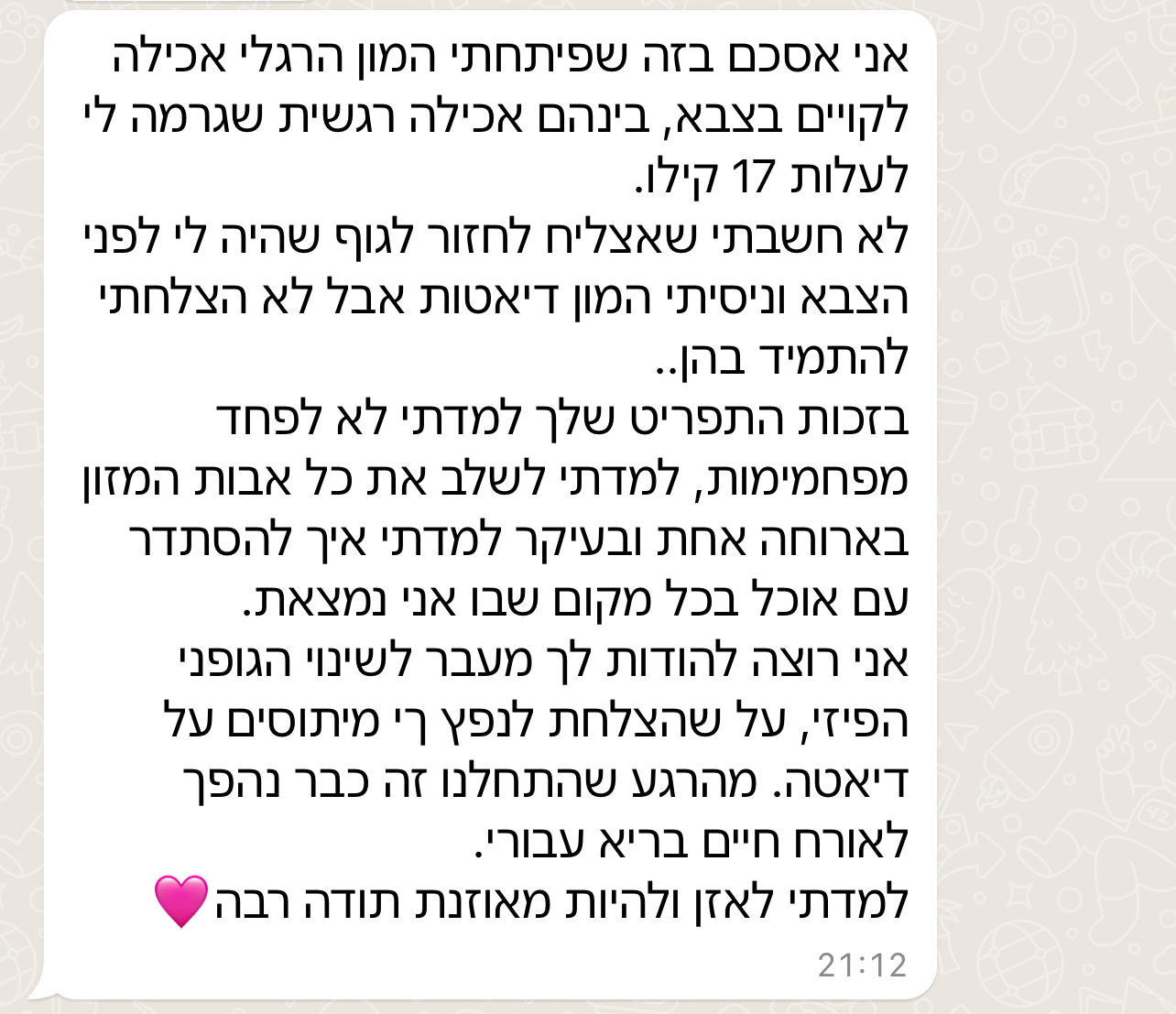 נכנסתי לתחום אחרי מסע אישי ארוך עם דיאטות ואיזון, עד שמצאתי דרך בריאה ונכונה לשינוי אמיתי.